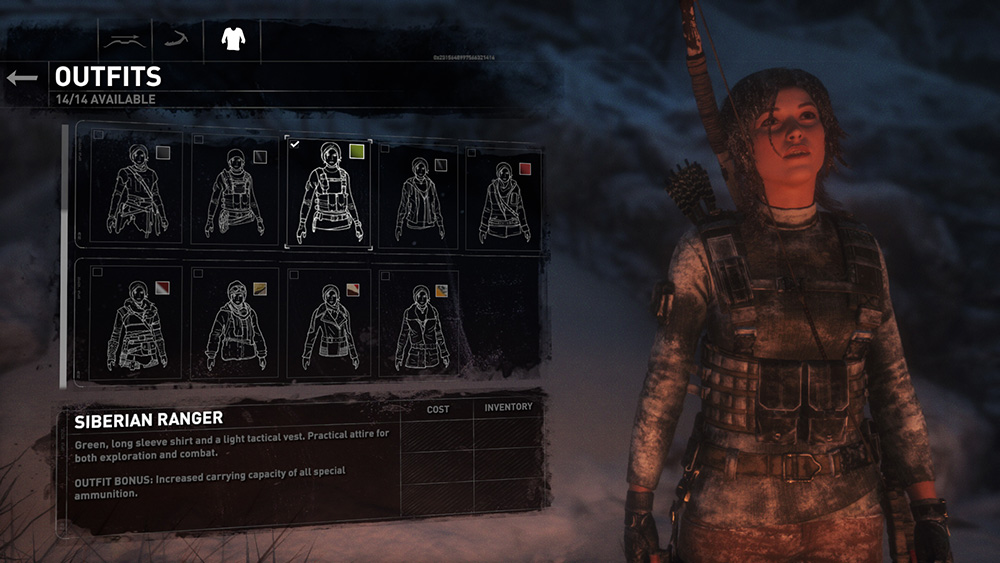 NOTES: If you own the Season Pass or the 20 Year Celebration Edition, you may want to change outfits now as well. The Siberian Ranger outfit (details/screenshot) allows Lara to carry more special ammunition, including poison arrows. To change costume, sit at the campfire, select Weapons, then tab to the right to select Outfits. Equip the Siberian Ranger outfit, then back out of the camp interface. You may need to gather more ingredients (wood and feathers for arrows, cloth and mushrooms to add poison), but you should now be able to craft 4 additional poison arrows, for a total of 6.