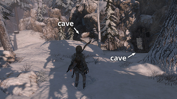 If you want 100% completion, you must return here after unlocking ROPE ARROWS. There's a cave on the south side of the main area, near where you found the Explorer Satchel during your first visit. This cave has a rope-wrapped barrier that can be pulled down with a rope arrow. Inside you'll find a relic (3/3), an Archer's Ring from the Mongolian Invasion set. If you didn't get the second relic earlier, as described above, you can now use the pistol obtained in the Soviet Installation (or any other gun) to break down the impact barrier. The cave with the second relic is also on the south side of the main area, just downhill from the cave with the rope barrier. This screenshot shows both cave entrances. They're also labeled on the level map.