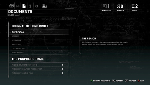 During this first campsite visit, Lara talks to herself even more than usual. A message on-screen tells you you've unlocked a document, which you can revisit in the documents section of your inventory. It's in the category Camp Journals and is called Familiar Pain. (screenshot) A separate series of 6 documents called Journals of Lord Croft are also unlocked at this time and can be accessed under Documents in the inventory. (screenshot) These are not counted among the numbered documents for this level.