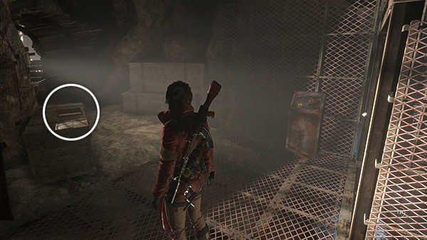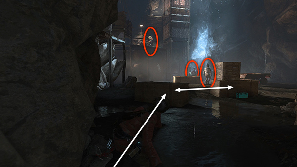 CAVE WITH BROKEN ELEVATOR: There are 3 Trinity soldiers here: one standing on the ledge above on the left and two more on the ground. Quietly move forward to the crates on the left so they don't notice you. (screenshot) You could then try to use distraction to draw one of them away and kill them one at a time, but these guys are not too hard to fight. If you take out the men on the ground first (using the Double Shot Skill if you've unlocked it), you can then kill of the one on the ledge. If he notices you, he'll start throwing grenades, but he won't jump down. So just move from left to right, from cover to cover, and shoot at him until he falls.