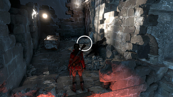 Advance carefully. If you unlocked the Bright Eyes Skill by completing the Red Mines Challenge Tomb, the crumbling floor ahead will glow red, warning of the spike pit below. Jump over this trap to avoid being skewered. (screenshot)