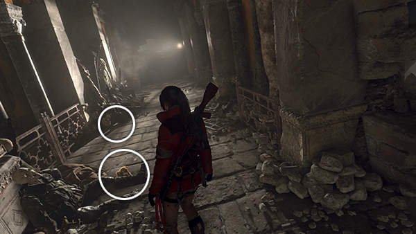 Before moving on, make a few more pickups in this area. If you deciphered the mural earlier, you'll find the last coin cache (3/3) buried just around the corner to the south. (screenshot) Climb the ladder to the ledge where the last enemy was standing to locate the final survival cache (3/3) and a locked strongbox (2/2) containing a BOLT ACTION RIFLE COMPONENT (2/4). (screenshot) You could follow the southern passageway back to the Pantheon Corridor Base Camp or just wait until you reach the next camp. There's no more combat in this level.
