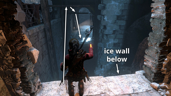 Drop down and continue to the left (northeast) toward the red light. Jump over another concealed spike pit and get some cloth from a container in a dead-end alcove. Turn around and jump to latch onto the wall of ice above and to the left of the spike pit. Climb up to emerge in the RUINED CHANCEL WITH THE SHALLOW POOLS where you fought the first Trinity squad earlier. (screenshots)