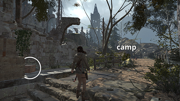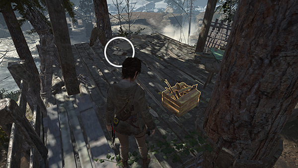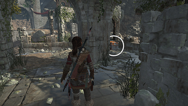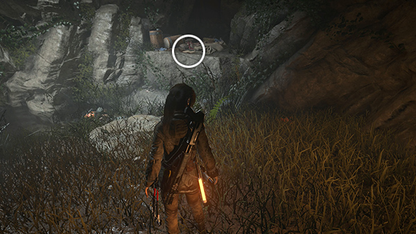 There is another CHALLENGE TOMB ENTRANCE just north of here, but it requires the WIRE SPOOL, which you don't yet have. So for now, head to the south to find the Ruins Encampment Base Camp. There are various minor pickups nearby (arrows, ammo, salvage) and and a box of supplies on the left between the remnant group and the campsite. (screenshot) As you approach the campfire, Jacob contacts Lara over the radio with a mission update. When you rest at the camp, you unlock a document called The Weight from the Camp Journals II series.
