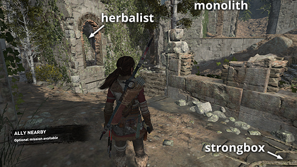 In the ruins near the campfire there's a monolith (2/3) and an Explorer Satchel (4/5). (screenshot) The monolith, inscribed in Greek, reveals 3 coin caches on your map. The satchel provides the locations of several survival caches and a strongbox (or two if you missed the last one). These pickups are all far from here, so we'll go after them later. There's also a salvage crate and feathers near the campfire, a box of cloth in the alcove with the satchel, a hardwood sapling and an herb bush nearby, and more cloth under the bridge.