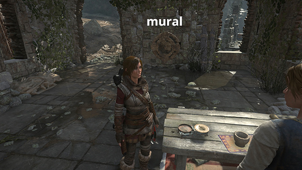 On the wall opposite the woman's worktable there's a mural (3/4), The Rebirth from the Byzantine Inscriptions series (Greek). (screenshot) After examining it, step outside and head for the next ruined building on the left (north). There's a monolith (3/3) at the base of this building (screenshot), but you need level 7 Greek to read it, which you won't have at this point. As long as you pass close to it, it will be noted on your map.