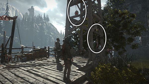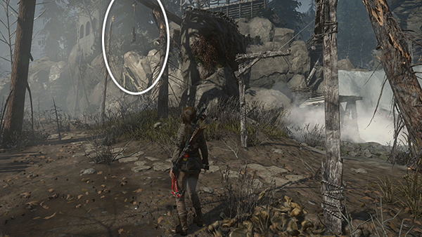 EXPLORING THE LOWER VALLEY - MUD FLATS BELOW THE GUARD TOWER: When you slide down to the valley floor either before or after raiding the House of the Afflicted Challenge Tomb, Jacob contacts Lara by walkie talkie. He apologizes for Sofia's hostility and suggests that Lara pitch in with the battle preparations in order to earn his people's trust. While he's talking, look for another snared rabbit (2/6) strung up just ahead and cut it down for the challenge. (screenshot)