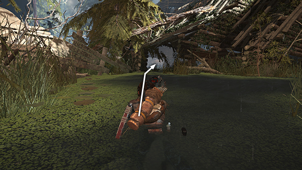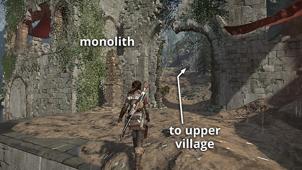 ENTERING THE UPPER VILLAGE: After making upgrades and equipping the weapons you want (other than the Assault Rifle or SMGs with Grenade Launcher, I have no particular preferences here), head up the hill past the Remnant herbalist's tower, turn left, and follow the path to the north of the monolith. (screenshot) Go through a ruined shack, where you can pick up some arrows. Then slog through a swampy area to the village. (screenshot) If you get disoriented, just activate Survival Instinct and follow the Objective Beacon.