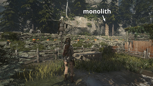 AREA NORTHWEST OF THE VILLAGE: If you prefer, you can wait to explore this area until later in the game when more of it is accessible. However, there are a few things you can do now, including raiding a crypt and completing the bull's-eye challenge. The crypt entrance should have been added to your map when you found Explorer Satchel #1 on the path leading to the first challenge tomb. To find the crypt, start by following the path out of the village to the northwest, just beyond the pumpkin patch and monolith. (screenshot)