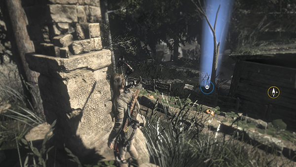 THE ARCHITECT'S CRYPT: To get to the crypt entrance, head up the steep path to the northwest. When you come to a wooden bridge near a small waterfall, get some cloth from the container on the right. Then cross the bridge and climb onto the low ledge ahead. Just before the barricade of pointed logs, move into the sunny clearing on the right. Here you'll find a survival cache (10/20) buried near the rock wall. (The next Explorer Satchel will reveal it on your map, but you can dig it up now.) There's also another bull's-eye (7/8) hanging from a dead tree. Shoot it down for the challenge. (screenshots)