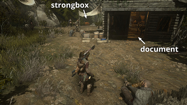 If you like, after completing the missions, you can return to the Valley Farmstead Base Camp at the southwest end of the village to change clothes and make upgrades. If you missed the first survival cache (1/20) near the strongbox at the top of the stairs, dig it up now. (screenshot)