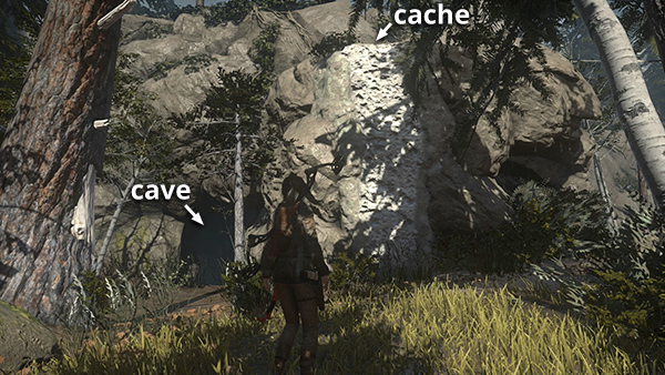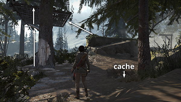 Dig up another survival cache (8/20) to the northwest, about halfway between the guard tower and the elevated shack with the ladder. (screenshot) Climb the ladder into the shack to find some arrows and another snared rabbit (4/6) for the challenge. (screenshot) Drop down and dig up another coin cache (3/9) near the base of the cliff wall between this shack and the lynx's cave. (screenshot) The cave entrance is blocked by brambles so you can't go inside.