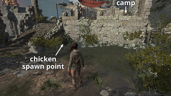 After leaving the crypt, you can return to the Ruins Encampment Base Camp to change weapons and make upgrades if you like. At this point, you can also unlock the Rotisserie Achievement/Trophy. The goal is to shoot a chicken out of the air with a fire arrow, but thanks to a minor glitch, it's much easier than it sounds. Equip the bow and select fire arrows. Then grab one of the chickens that tend to flock around this campsite. Drop the chicken (C/Circle/B) and while it's flapping around, quickly shoot it with a fire arrow. The achievement/trophy should unlock. (Thanks to Tomb Raider Discord for this helpful tip!)