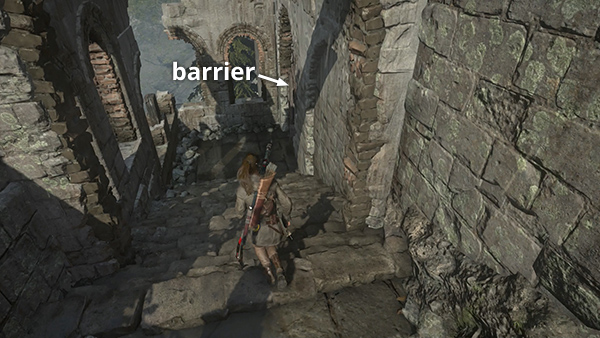 You first enter this area through a flooded tunnel from the ABANDONED MINES. Proceed along the wide corridor to emerge outdoors. Pick up rifle ammo and arrows in the rubble-strewn courtyard. Then climb the broken stairs and follow the path up and around to a zip line. Slide into the village below for a warm welcome from Sofia.