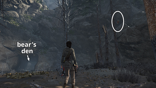 Here on the north side of the stream there's a barren clearing and another BEAR'S DEN with a big, tough bear inside. You can fight it now if you want, but the CHALLENGE TOMB ENTRANCE at the back of its cave is not accessible until you unlock the REBREATHER, so it is covered later. Unless you need the hide for a special project, I would wait. Look up in the trees to the right of the cave entrance to spot a bull's-eye (8/8). (screenshot) Shoot it down to complete the Bull's-Eye Challenge for bonus XP and 2,000 Expedition Credits.