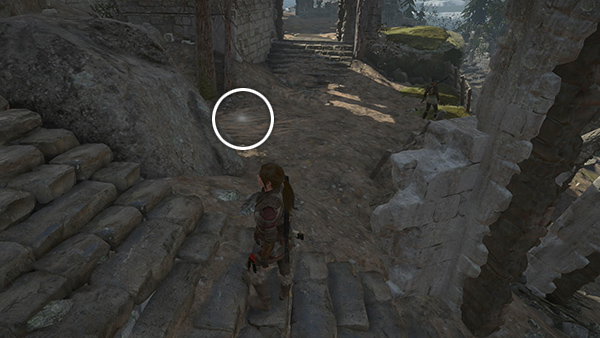 Now head up the hill behind the Ruins Encampment Base Camp. Follow the stairs on the left (screenshot) then about halfway up, look to the right, and you'll find a survival cache (11/20) buried in the mud. (You can use your map to pinpoint the location if you found the first Explorer Satchel earlier). (screenshot)