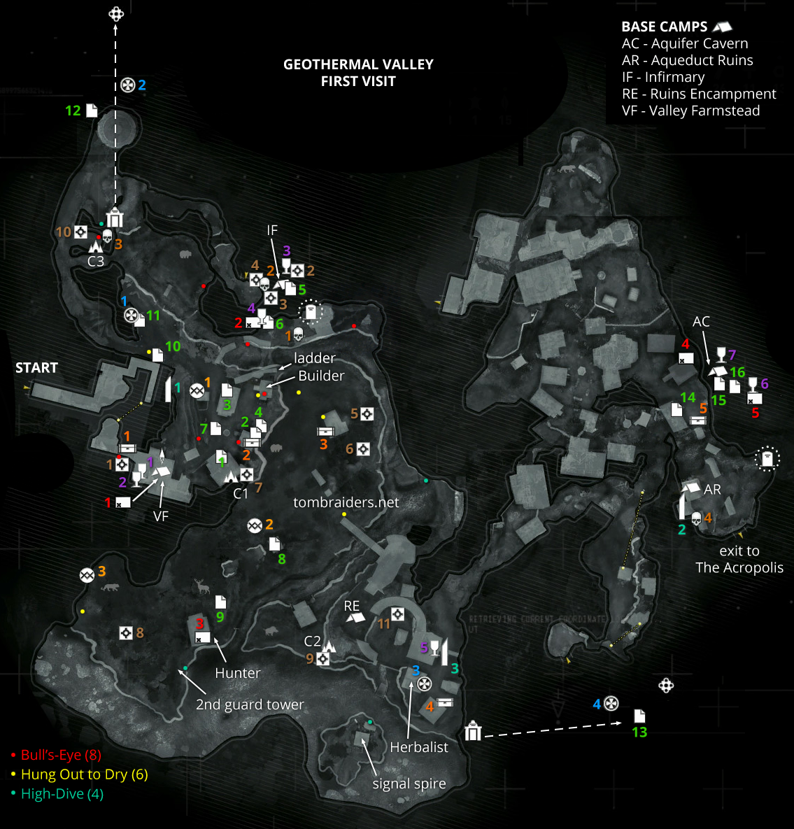 6/5/16 - Combined what was originally two sections into one larger document: Geothermal Valley First Visit. Added challenges to the level map. Rearranged a few sections while playing through the PC version, including the order of the first few documents and survival caches. Added screenshots for climbing the stone tower in the village on the cliffside. Moved the Achievement 'For My Next Trick' into this section. It was originally in the second-visit walkthrough. Shifted the High-Dive Challenge to a separate section at the end. Also added markers for the challenge items to the annotated level map. Thanks to Shannon P. and Amy M. for several helpful suggestions for this revision.