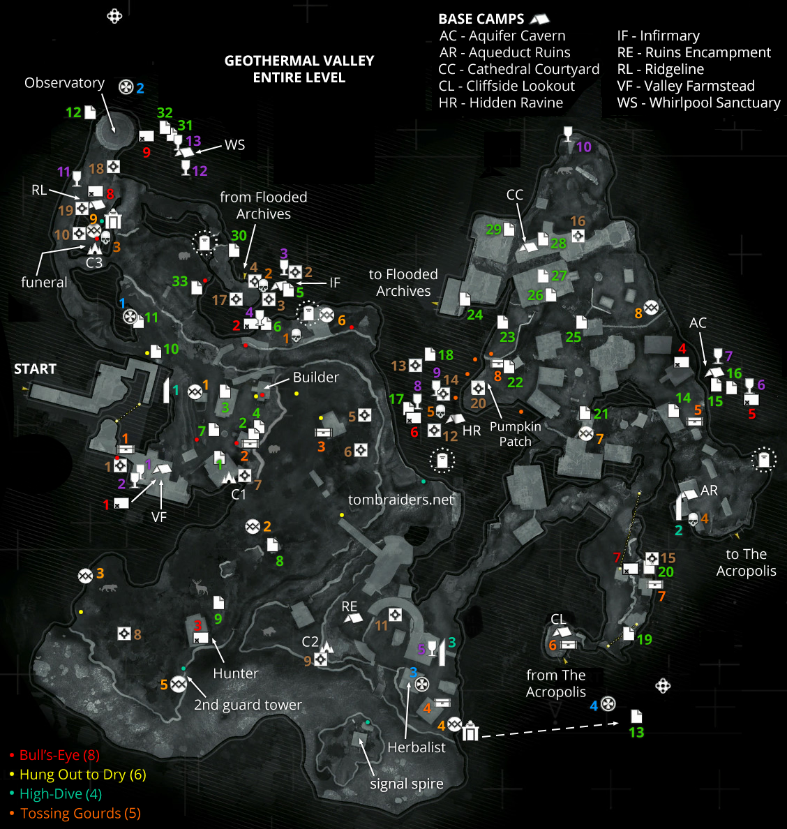 Camps: Valley Farmstead, Infirmary, Ruins Encampment, Aqueduct Ruins, Aquifer Cavern