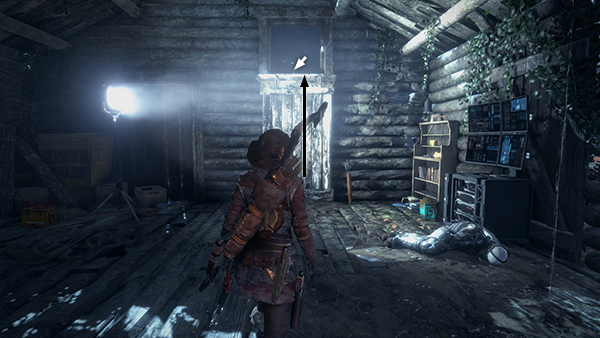 OCCUPIED VILLAGE - MIDDLE LEVEL: Again, you can sneak through this area following the strategy laid out in the Crystal Dynamics video, engage in an all-out firefight, or gradually take out the men in this area using stealth combat. Here's one possible sequence: Wait at the starting point behind the boxes until the 2 armored soldiers move away toward the small enclosure to the west. Then go up the steps into the cabin directly opposite the window you just scrambled through. Pick up a bottle or can and toss it into the far corner. This should attract the single soldier standing outside. If you hide behind the desk, he'll pass directly in front of you. You can then take a headshot with your bow or sneak around behind him and press Melee for a stealth takedown. Loot the body and sneak back out the way you came. (screenshots)