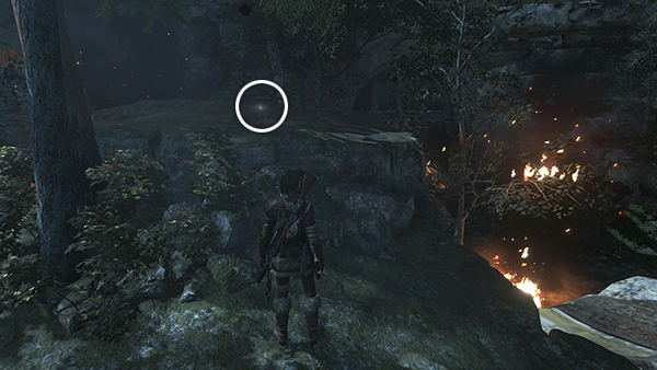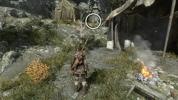Finally, there are two more olive drab tents near the western edge of this area. Another survival cache (2/3) is buried near the tent on the left. Again, you can probably find it by looking for the flash (screenshot), or you can wait until later when you find the Explorer Satchel that reveals all 3 caches on your map. When you're finished here, follow the road to the south.