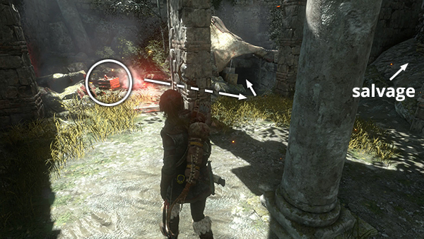 When the coast is clear, pick up rifle ammo, grab some rifle grenades from the box on the right, and climb up into the building with the arches to search the enemy corpses and find containers of cloth and salvage. There's also a survival cache (3/3) in the northeast corner of this building. If you stand outside, you should be able to spot the flashing light that shows where the cache is buried. Or, you can wait to find the Explorer Satchel, which will mark all 3 caches on your map. (screenshots)