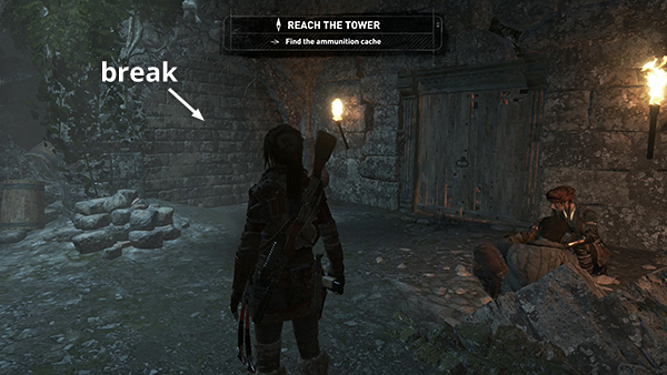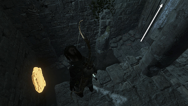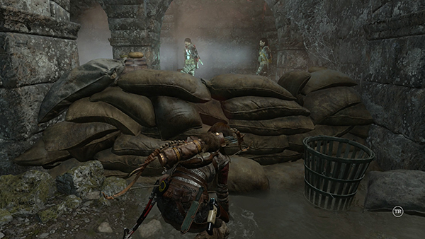 BASEMENT ROOM WITH SANDBAGS: As you advance toward the light, an explosion destroys the floor, dropping Lara into the room below. While you gather your wits, 2 more enemies wander in from the right. Stay hidden behind the wall of sandbags so they don't notice Lara. (screenshot) Then use a poison arrow or make a molotov cocktail from one of the nearby bottles to kill them both. Or, shoot an arrow into the wall directly ahead of the sandbags to draw one of the men away. Then take him down with a silent headshot, and do the same with his buddy. In addition to whatever items the men were carrying, there are mushrooms growing in the northeast corner, plus cloth and more mushrooms in the alcove to the southwest. When you're ready to move on, go through the raised opening in the southeast and follow the passageway to the left. (screenshot)