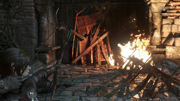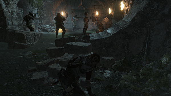 As you continue along the cobbled street to the south, two slain Remnant warriors fall across your path. Take out the Trinity soldier who killed them by leaning around the corner. Click the left stick or press Shift to adjust your aim so Lara leans out to the left. (screenshots)