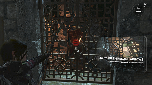 Climb back onto the ledge, aim through the metal lattice, and press RB/Middle Mouse to fire a grenade arrow and destroy the barrier. (screenshot)