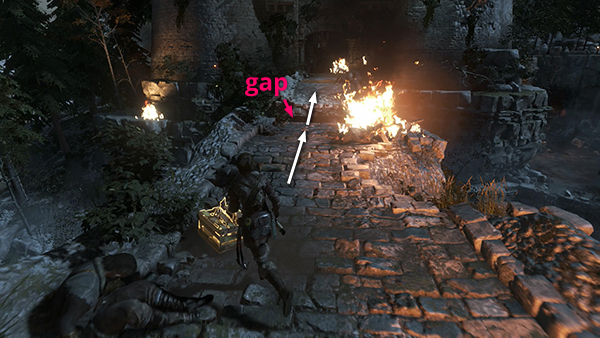 Pick up another relic (3/3), Bullae from the Tokens of Faith set, lying on the ground at the north end of the bridge. (screenshot) Then head to the other end of the bridge, grabbing some salvage on the way and jumping across the wide gap in the middle. (screenshot) Beyond the gap, take an explosive arrow from someone who won't be needing it anymore and use it to destroy the metal barrier. (screenshot) Hold RB/Middle Mouse/R1 without drawing your bow to craft more grenade arrows. Then squeeze through the gap under the door into the next area.