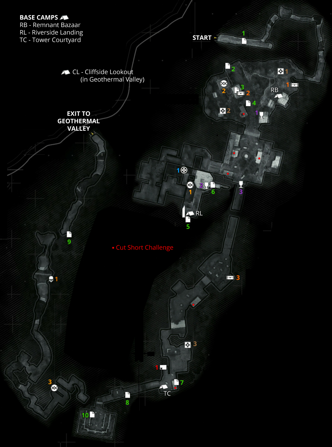 Camps: Remnant Bazaar, Riverside Landing, Tower Courtyard