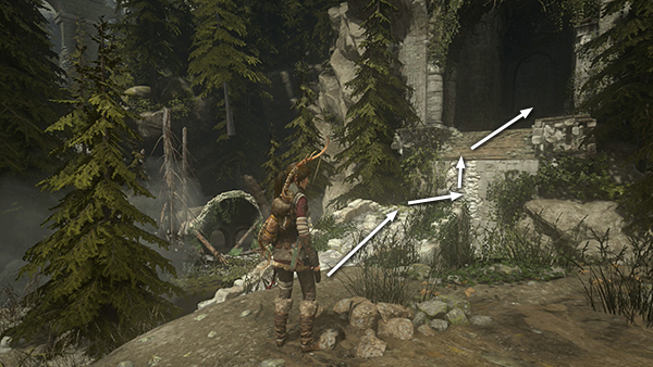 CANYON PATHWAY TO THE ACROPOLIS: Use the fallen tree to cross the wide gap between ledges. Then turn right, jump across another gap, and scramble up the rock wall into the narrow canyon leading off to the east. Continue past a small waterfall to a dead end above a deep pit. Jump across the pit and latch onto the climbable wall. Climb up and around until you're able to dismount on the ledge on the upper right. At the top of the next flight of stairs, your goal is updated. (screenshots)