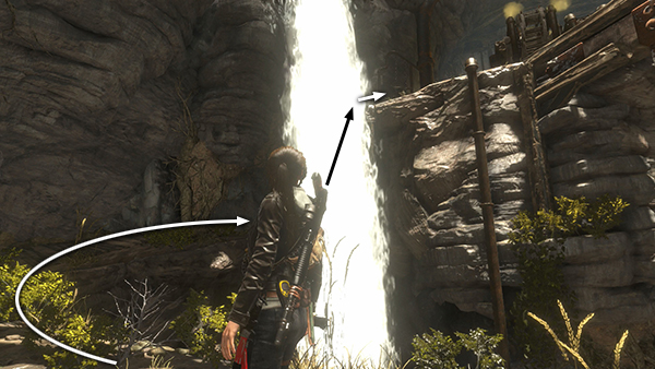 When you've defeated the wolves, the witch reappears and chases Lara off the cliff ledge into the river below. Be thankful for cold water for once, since this seems to snap Lara out of her hallucination. She surfaces in a narrow canyon with falling water and a series of rusty metal tanks and pipes. After a brief conversation with Nadia over the radio, you now have a new goal.