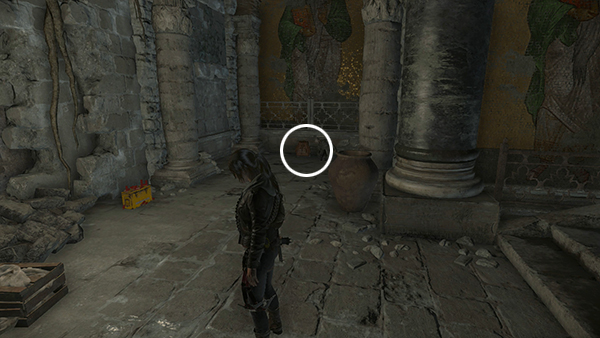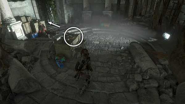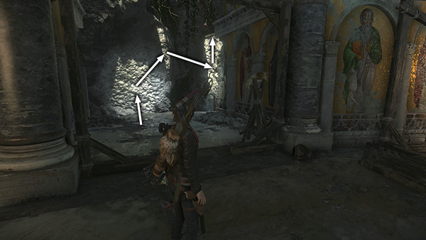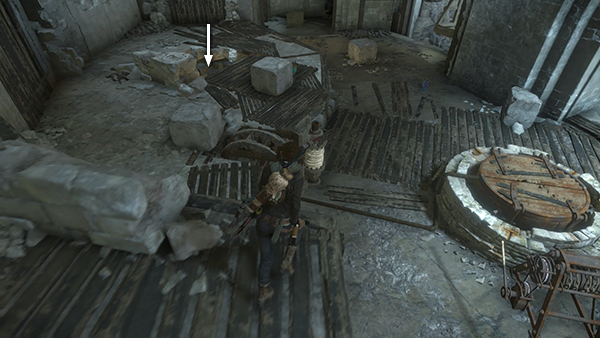 Go around to the far left corner of the pool (there are arrows here if you need them), and then jump across the raised platforms to the ledge on the far right. You'll find more arrows leaning against the wall behind a second winch. Before doing anything with that, jump up onto the stone wall that juts out beside the winch. Go around behind the wall to find a document (12/21), The Gulag Burns from Nadia's Grandfather's Journal (Russian) Climb back down to the second winch. Stand beside it and shoot a rope arrow into the second spool directly across the pool from here. This will allow you to raise the third platform, next to the spool, but don't bother doing that yet. (screenshots)