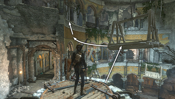 Stand next to the winch facing the 2 dangling platforms on the far side of the pool. Shoot a rope arrow into the large spool above the 2 platforms in order to attach this spool to the winch. Now use your axe to crank the winch as far as it will go. This raises the platform on the right and lowers the one on the left. Once you release the axe handle, the spool will start to unwind, and the platforms will gradually move back to their original positions. So quickly move to the rope-wrapped post just to the right of the winch, wait until the platform on the right is just a little higher than the one on the left, and then shoot another rope arrow into the spool to hold the platforms in place. If they descend too far, just crank the winch and try again. When you've anchored the line to the post, the first rope line falls away automatically, but that's OK. (screenshots)