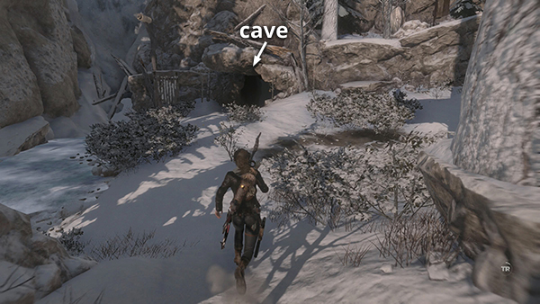 CANYON LEADING TO THE WICKED VALE: Follow the pink objective beacon to the cave on the east side of this area. (screenshot) This cave is marked C4 on the Soviet Installation level map. Note that a snow leopard sometimes guards this cave. I'm not sure exactly when it appears or how often it respawns after the first time you kill it. So stay alert just in case. If you do see it, there are tips on defeating it in the Logging Camp Second Visit walkthrough.