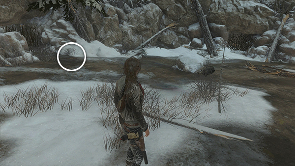 ENTERING THE VALE (WITH THE ANTIDOTE): Head up the steps near the campsite and squeeze through the opening into the vale. This time Lara has come prepared, so there are no hallucinations. Follow the canyon down past the rows of creepy skeletons. As you emerge into the forest, head to the right to find a survival cache (1/6) buried near the curve in the west side of the path. (screenshot) Use the flash to help find it, check the annotated map, or wait until you've found the Explorer Satchel later on and the cache will be marked on your map.