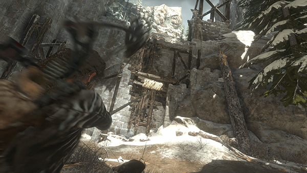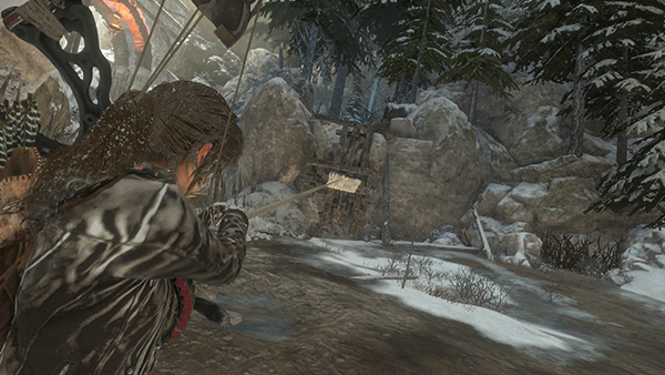 Dive into the pool and climb out on the ledge where you started. Press the Melee button to cut the rope anchoring the platforms to the post. (NOTE: If you have not yet unlocked the Combat Knife, you can just skip this step.) Then run another rope line from the first winch to the large spool above the 2 platforms, just as you did before. Crank the winch again to move the platforms. Move back to the post on the right, wait for the platforms to move so the one on the left is slightly higher than the one on the right, and then shoot a rope arrow into the large spool to anchor the platforms in place. (screenshots)
