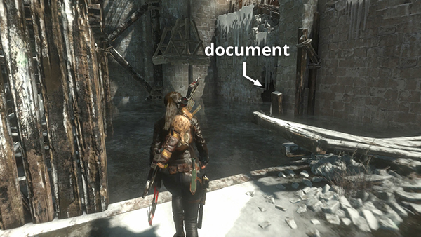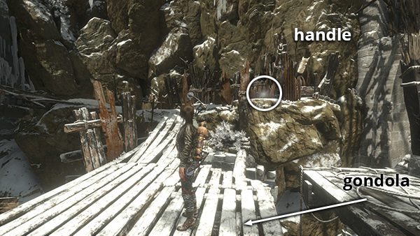ENTERING THE WITCH'S CAVE: When the gondola comes to a stop at the western end of the canyon, jump through the waterfall to the south into a small alcove containing a document (13/21), Ill Omens from The Lost Engineers series (Greek). (screenshot) Jump back onto the gondola and then jump over to the wide wooden ledge in front of it. Go up the ramp on the right and you'll find a survival cache (3/6) buried on the snowy ledge near the rope-wrapped lever. (screenshot)