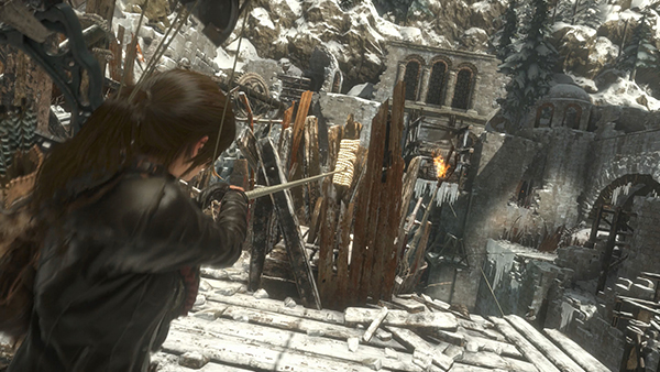 After this, Nadia contacts Lara by radio. She drops the news we've probably all suspected, but this doesn't affect your mission. You still need to defeat the witch. Pick up some loose feathers lying near the rope-wrapped barrier and use a rope arrow to pull it down. Go through, get some ammo and herbs, and then use your axe to activate another mechanism. This adds a second set of platforms to the ones already circling the room. (screenshots)