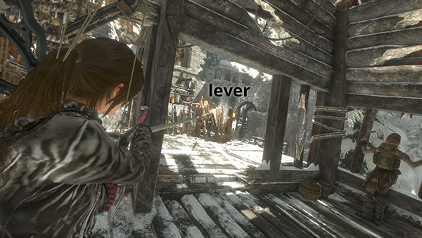 As Lara mixes the antidote, Nadia warns her of an approaching enemy patrol. Turn around and take out 2 men who climb onto the roof ahead. Then either jump over to the roof where they were standing and deal with 3 more Trinity soldiers down in the yard to the right, or shoot them through the windows of the room where you found the chemicals. (screenshots)