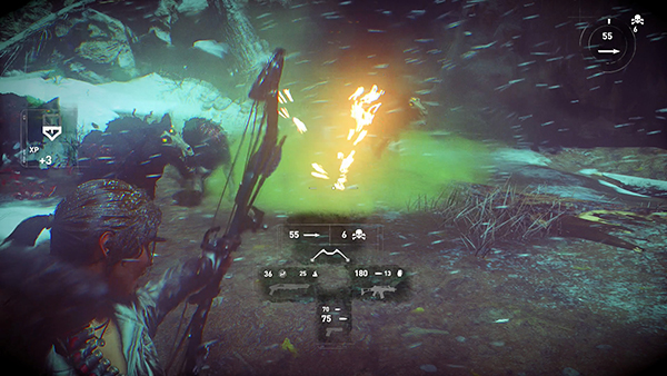 First deal with the witch's minions, who drop down from the ledge on the southwest side of the room and try to flank you. There are 5 enemies in this first group: 3 archers and 2 with knives. They behave very much like the Deathless warriors in the later levels of the main game. So if you played through the story before tackling this DLC, you'll be familiar with their tactics. The ones with knives rush at Lara, so take them out with the shotgun or Dodge Counter/Kill maneuver (assuming you've unlocked those skills). The archers use fire arrows and tend to sneak up gradually while taking occasional potshots. Use your rifle or bow to pick them off. (screenshots)