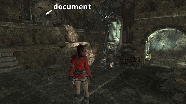 This one is in the room where you found the REVOLVER. To get back there after completing the level, fast travel to the Train Yard Base Camp. Climb through the opening in the southeast wall, enter the building where you fought the soldiers, and then scramble through the raised opening on the far left. The document is in the next room to the right. See the walkthrough and level map for details. (Click screenshot to enlarge.)