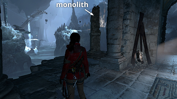 The monolith is near the room with the chandeliers, where you fought the second large group of Trinity soldiers. To get back there, carefully climb down the ice wall inside the circular spike pit (marked on the map and described in the last section of the walkthrough). Step out onto the ledge overlooking the canyon and you'll see the monolith on the right. (Click screenshot to enlarge.)