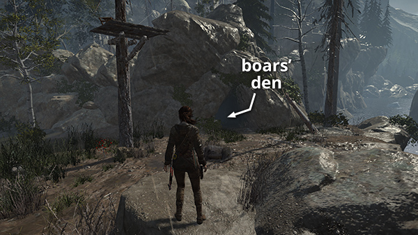 When you locate the boars, shoot two of them and loot their carcasses. You'll get meat for the mission, as well as hide and boar fat, which can be used as a lubricant to make various weapon upgrades. (Click screenshot to enlarge.)