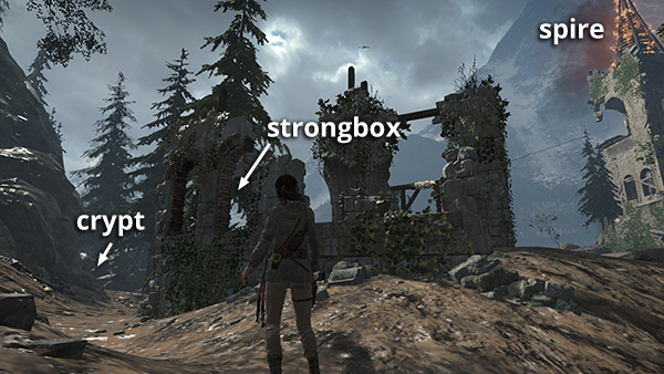 This strongbox is sitting near the Cliffside Lookout Base Camp, where you re-enter the valley after completing THE ACROPOLIS. Refer to the map and walkthrough for details. (Click screenshot to enlarge.)