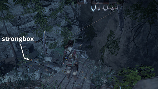 The next strongbox is down in the lower valley. It's sitting on the deck of the wooden structure a little way east of the bear's den and the ladder leading back up to the village. There is also a rabbit for the Hung Out to Dry Challenge strung up nearby. See the map and walkthrough. (Click screenshot to enlarge.)