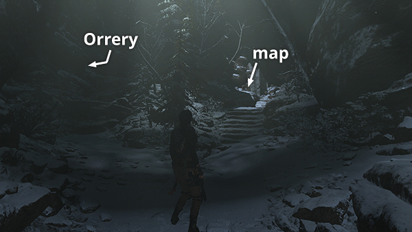 The map is at the very beginning of the level, just after you leave THE ORRERY. At the top of the stairs leading down to the huge, stone archway, turn around and you'll see a staircase leading up to the west. The map is spread out on the rocks at the top of the stairs. To retrieve it later, fast travel back to the Solemn Crevasse Base Camp in THE ORRERY and retrace your path to this point as described in the last section of the main PATH OF THE DEATHLESS walkthrough. (Click screenshot to enlarge.)