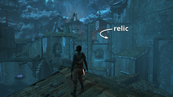 The first two relics are in the Chamber of Exorcism Challenge Tomb. You can follow the walkthrough to find them or, if you've already raided the tomb, return to the Citadel Plaza Base Camp, go down the stairs to the south, and then head back to the bear's den in the northeast corner of the city. The relic is in the cave beyond the doorway you broke down with your climbing axe. (Click screenshot to enlarge.)