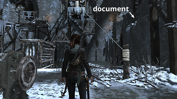 The next 3 documents are in the rope works area where you must raise the wooden platforms in order to reach the gondola. You can get all three on your first playthrough by following the walkthrough. Or return here later from either base camp. Document #10 is sitting on a crate in the northern corner of the lower level. (Click screenshot to enlarge.)