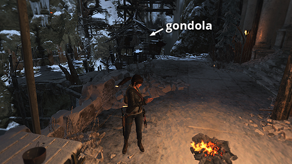 If you missed the first four lanterns, you can also shoot them from the platform where you board the gondola at the east end of the canyon. Here, Lara is standing on the platform with the lever that calls the gondola. Lanterns #1 and #2 are hanging near the end of the gondola cable. (Click screenshot to enlarge.)